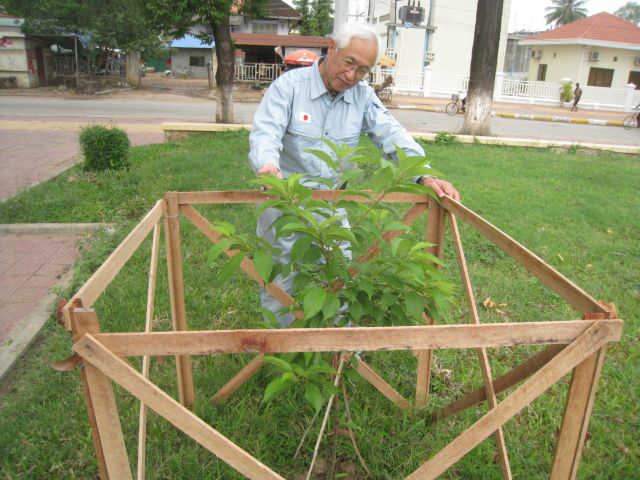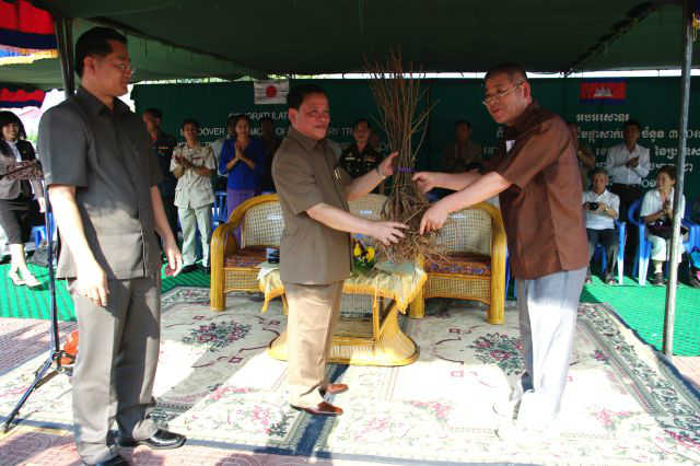 2011.3.4(金) 愛媛県松山市にあるNPO法人 日本さくら交流協会の皆様が、桜(陽光)300本を、カンボジア王国バッタンバン州に寄贈されました。これは愛媛県とバッタンバン州の皆様の交流を促進して、将来の姉妹県構想の一環事業に位置づけられるもので、大きな意義と将来に大きな楽しみをもたらした素晴らしい出来事だと思います。世話役を下さった当協会の脇坂事務局長は、「バッタンバン州のソンカイ川の畔に、桜が咲いて日本とカンボジアの友好の輪が広がるといいですね」と桜の成長を楽しみにしておられます。